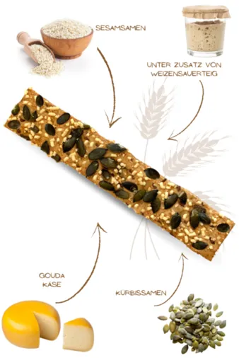 Thin Crispbread with the addition of wheat sourdough, sprinkled with Gouda Cheese and Pumpkin Seed.