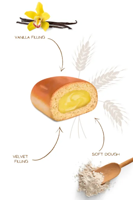 nadzienie o smaku waniliowym 35% [woda, cukier, syrop glukozowo - fruktozowy, skrobia modyfikowana (E1442), barwniki (E516, E160a, E101), stabilizatory (E460, E466), sól, substancja konserwująca (E202), kwasy (E330, E332ii), aromat], mąka pszenna, tłuszcz zwierzęco - roślinny utwardzony [tłuszcz zwierzęcy, woda, tłuszcze roślinne (tłuszcz palmowy, olej rzepakowy, tłuszcz rzepakowy całkowicie utwardzony), emulgatory (lecytyna rzepakowa, mono- i diglicerydy kwasów tłuszczowych), sól 0,4%, substancje konserwujące (kwas sorbowy, sorbinian potasu), regulator kwasowości (kwas cytrynowy), aromat, barwniki (annato, kukrkumina), substancje wzbogacające: witaminy A, D3, E], masa jajowa, cukier, drożdże, woda, polepszacz [emulgatory uwodnione (mono- i diglicerydy kwasów tłuszczowych, mono- i diglicerydy kwasów tłuszczowych estryfikowane kwasem mono- i diacetylowinowym), środek konserwujący 1,5% (propionian wapnia)], polepszacz [gluten pszenny, aromat, środek konserwujący (propionian wapnia), mąka pszenna, przeciwutleniacz (kwas askorbinowy)], mleko w proszku, środek do nabłyszczania pieczywa [białka mleka, laktoza, regulator kwasowości (węglan sodu)], aromat, sól