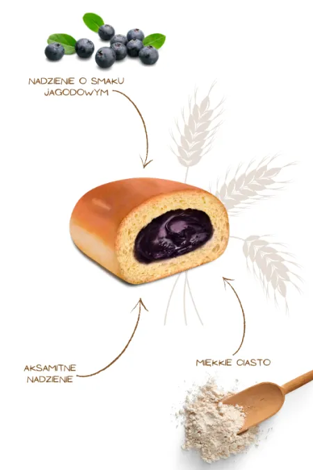 Wnętrze naszej drożdżówki kryje w sobie aksamitne nadzienie o intensywnym smaku jagód. Delikatność i bogactwo smaku nadzienia stanowią idealne uzupełnienie lekkości ciasta, tworząc doskonałe połączenie smakowe.